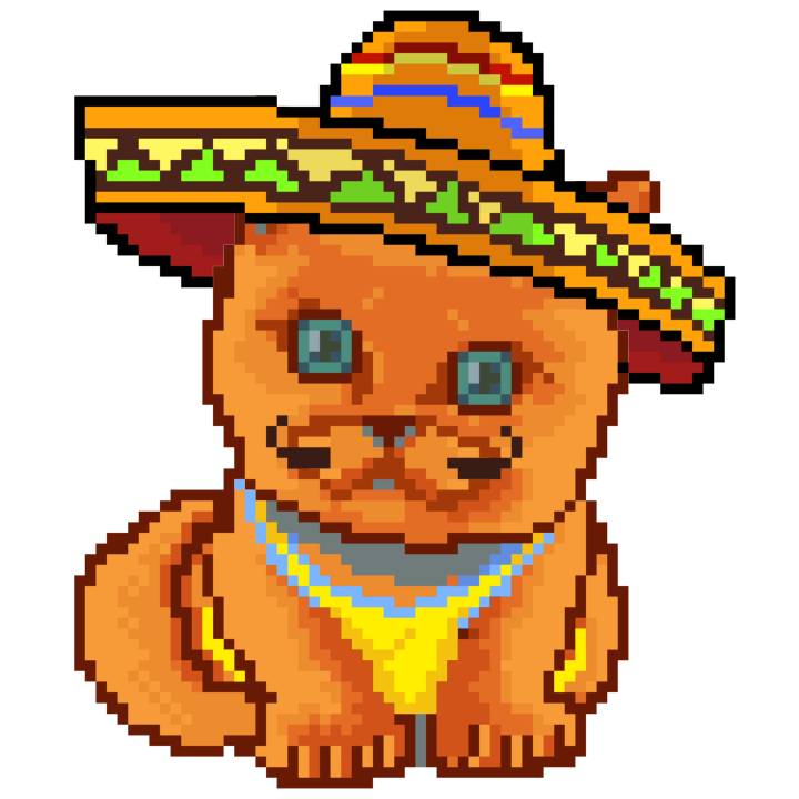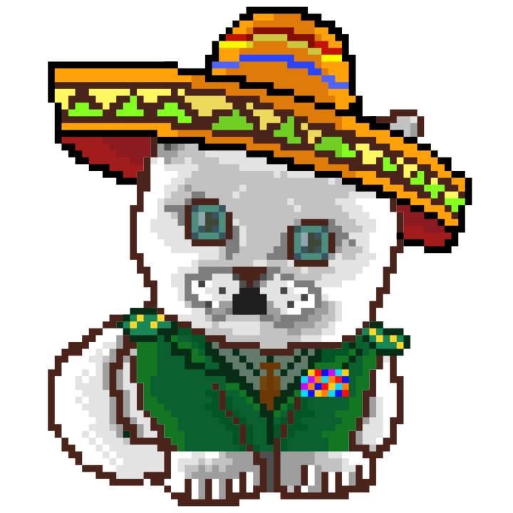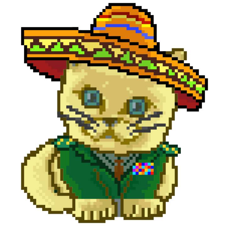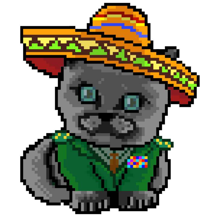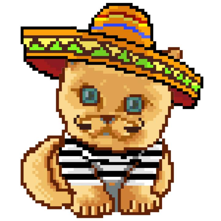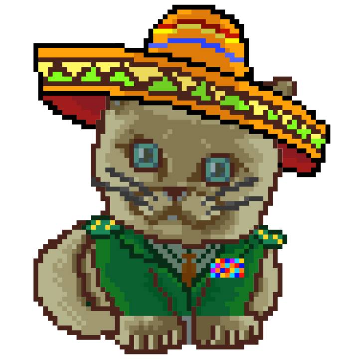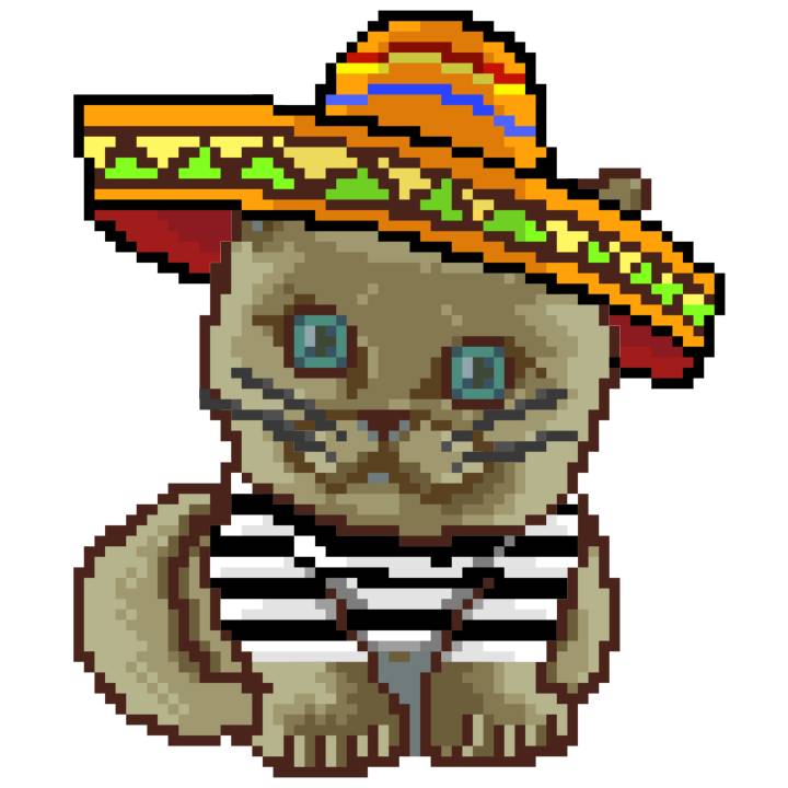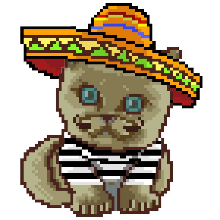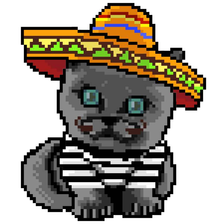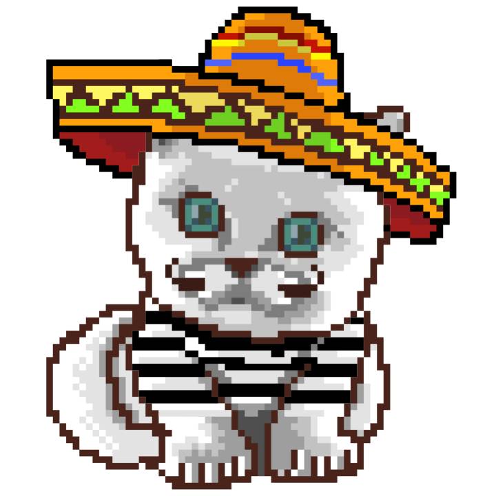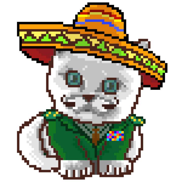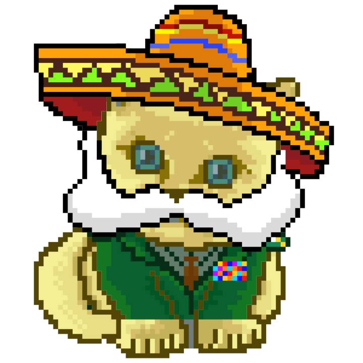 | Ashy Flashy Cat #52 | 570 | SandyBrown | Sombrero | Handlebar Mustache | General Top | View Image | View CatPage | View Opensea open_in_new |