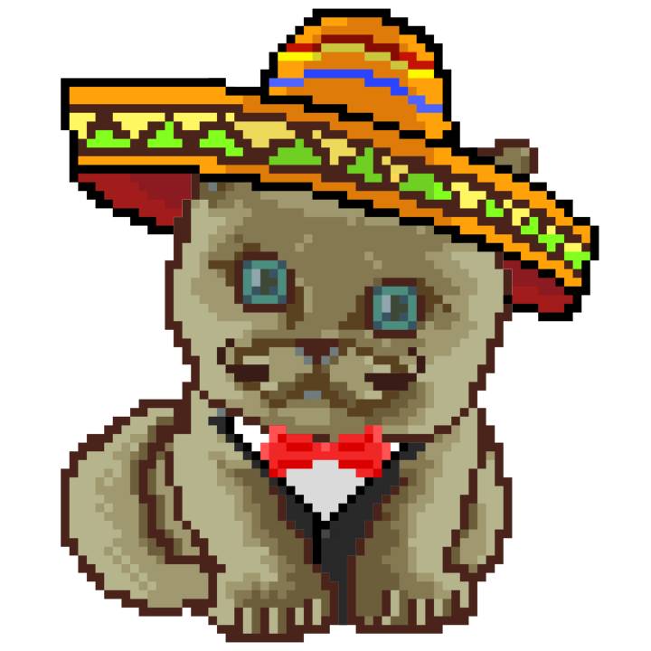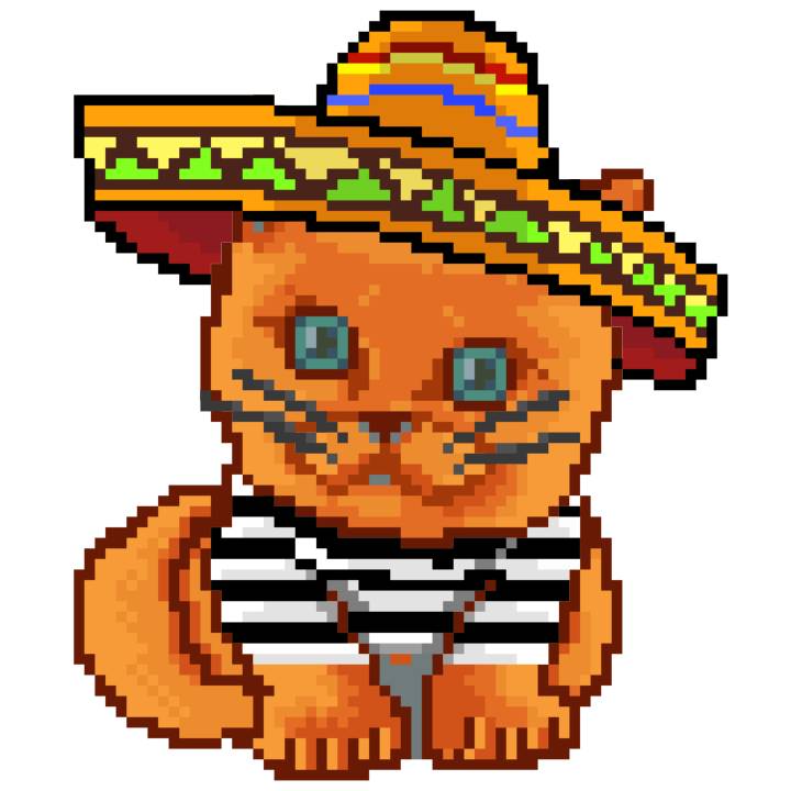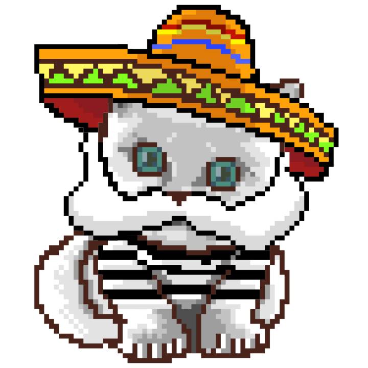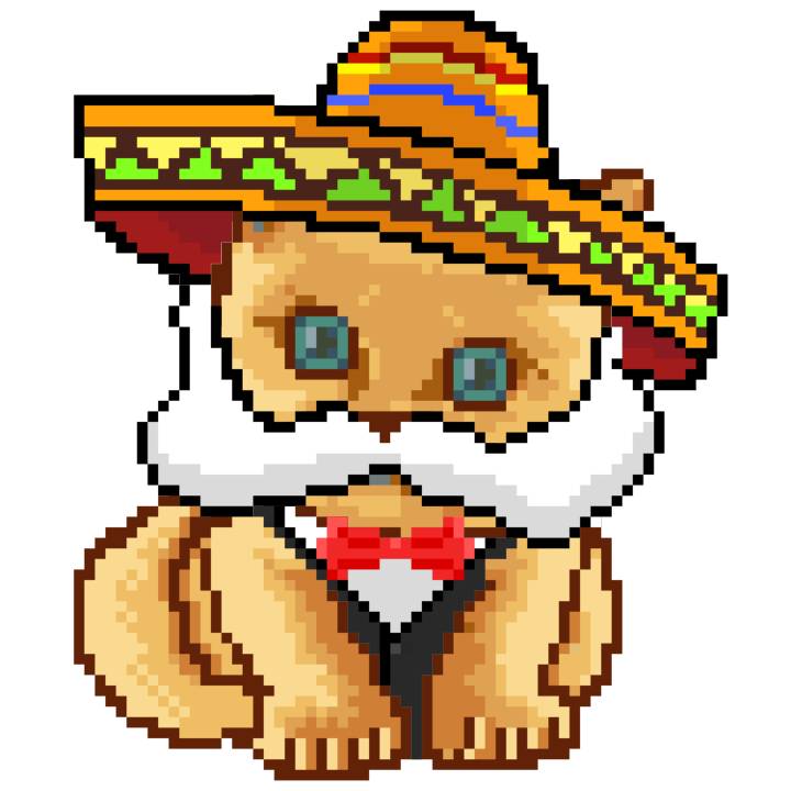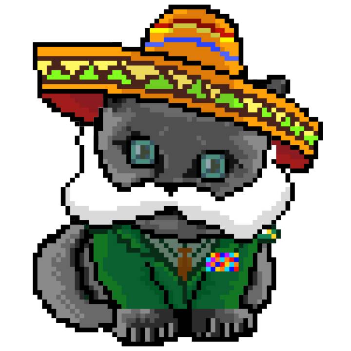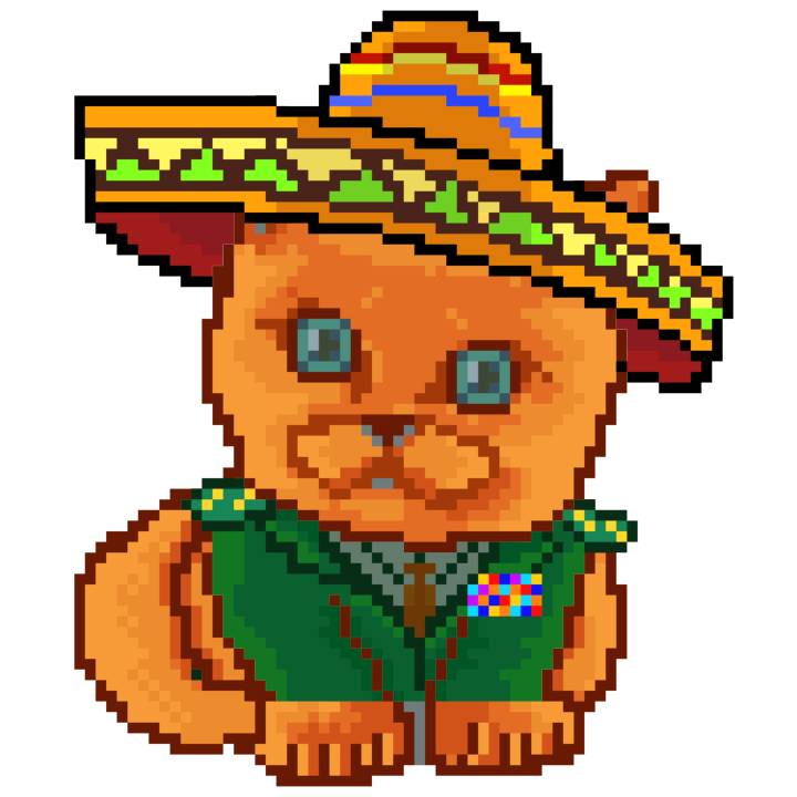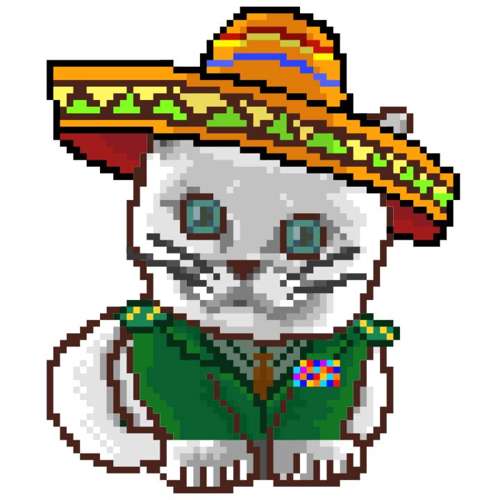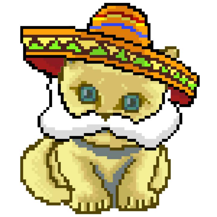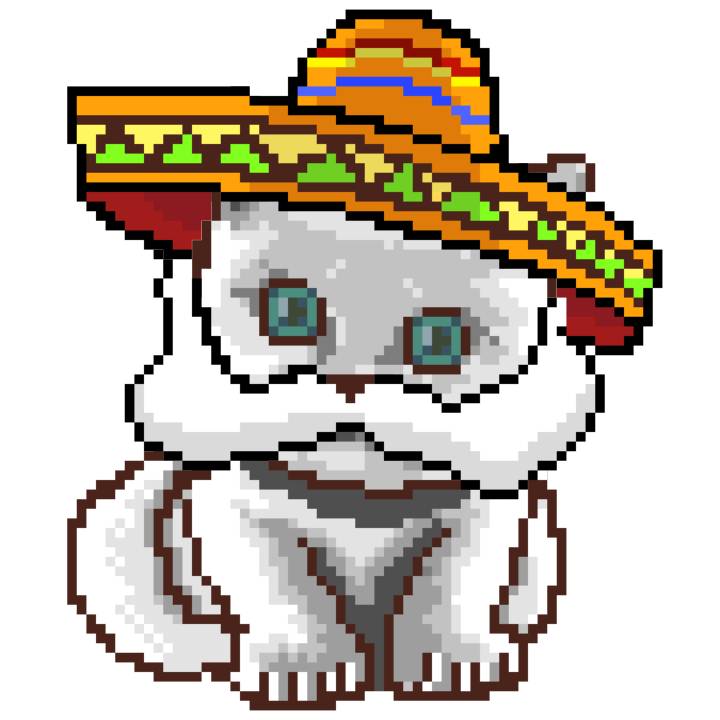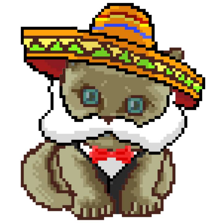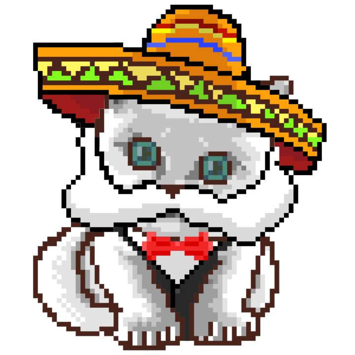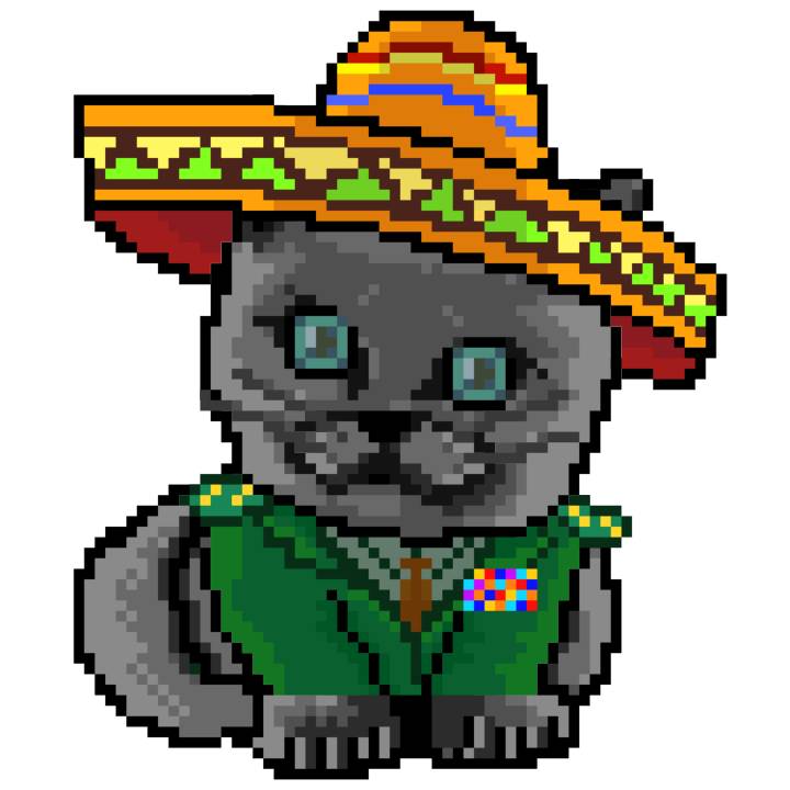 | Ashy Flashy Cat #52 | 570 | SandyBrown | Sombrero | Handlebar Mustache | General Top | View Image | View CatPage | View Opensea open_in_new |