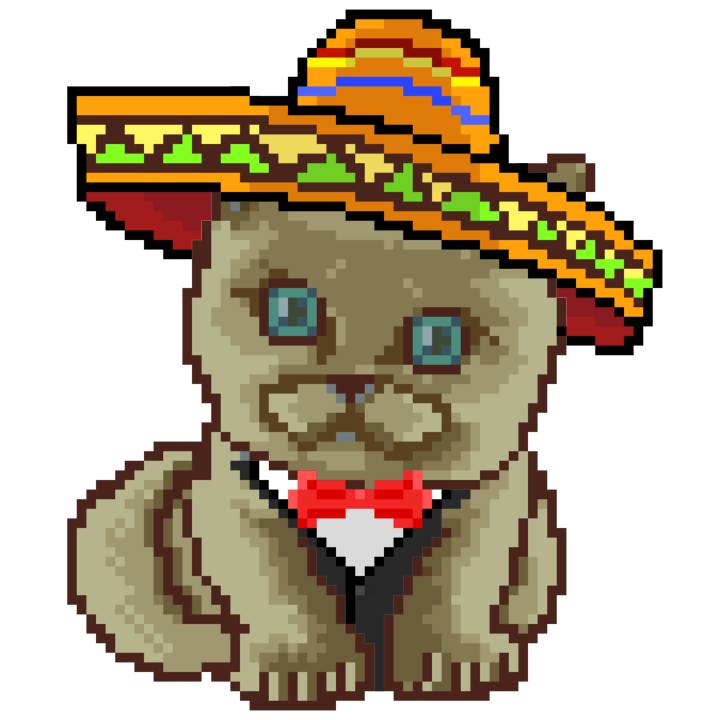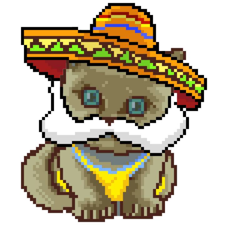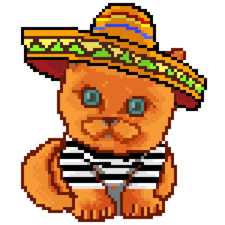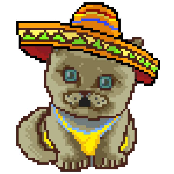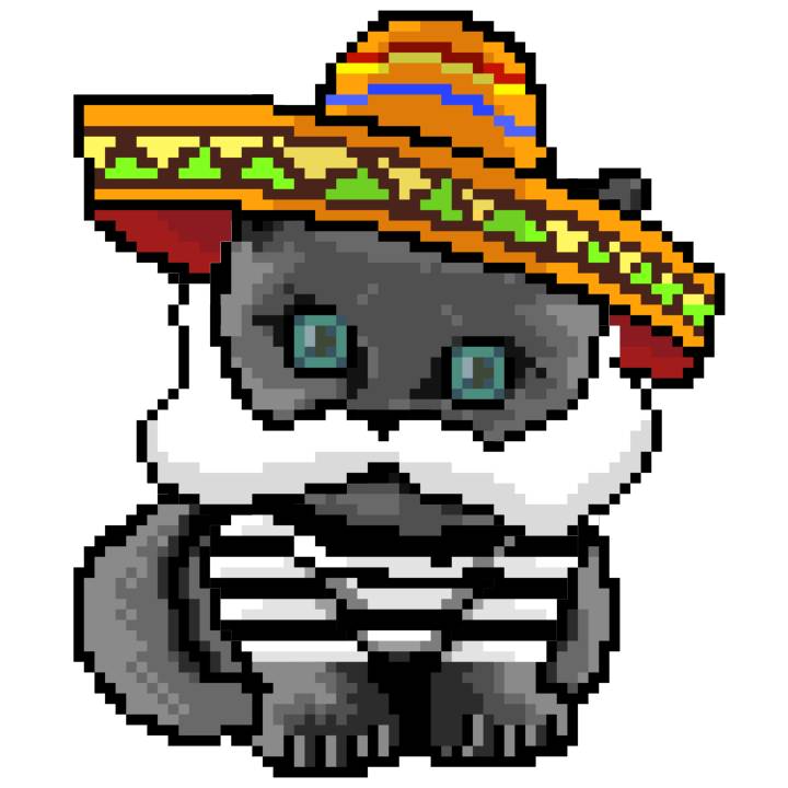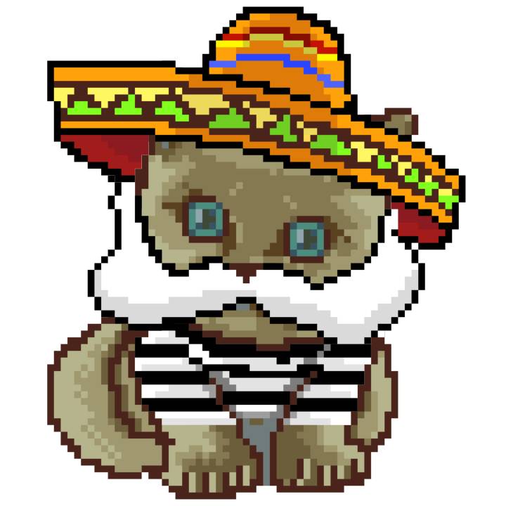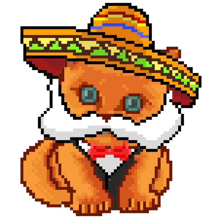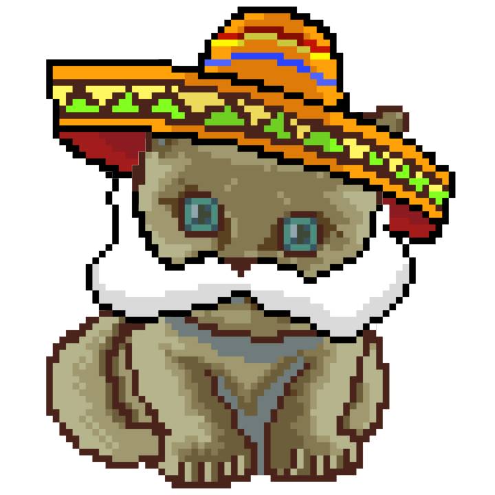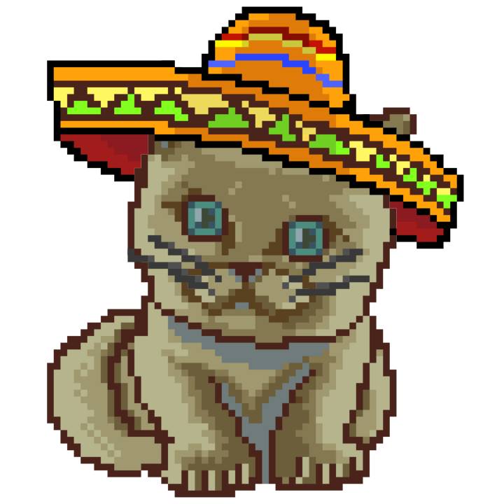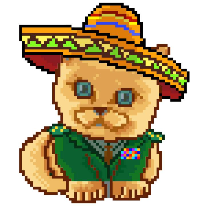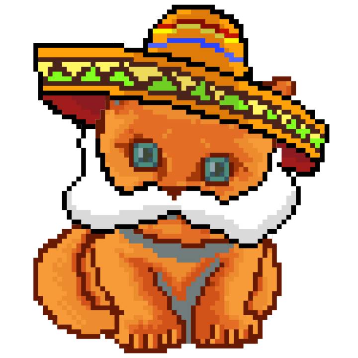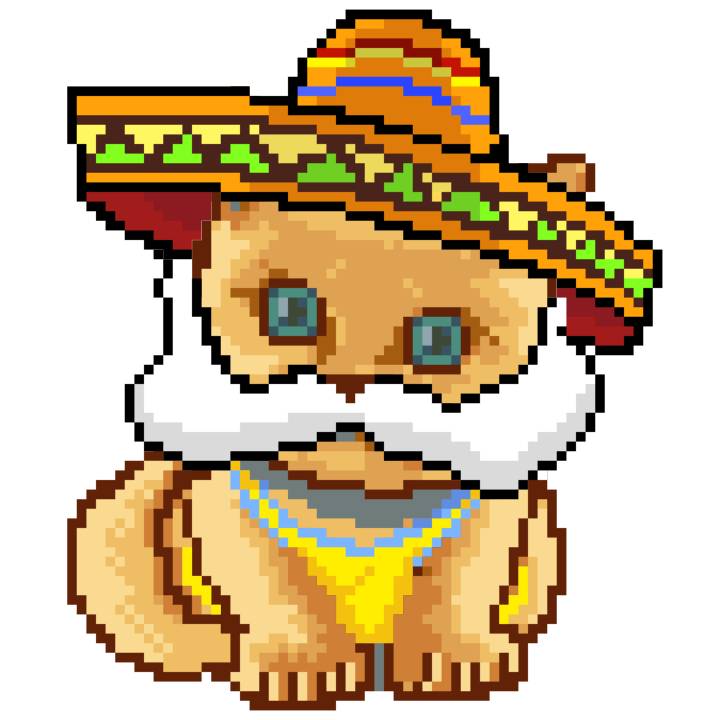 | Ashy Flashy Cat #52 | 570 | SandyBrown | Sombrero | Handlebar Mustache | General Top | View Image | View CatPage | View Opensea open_in_new |