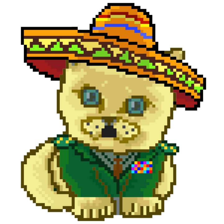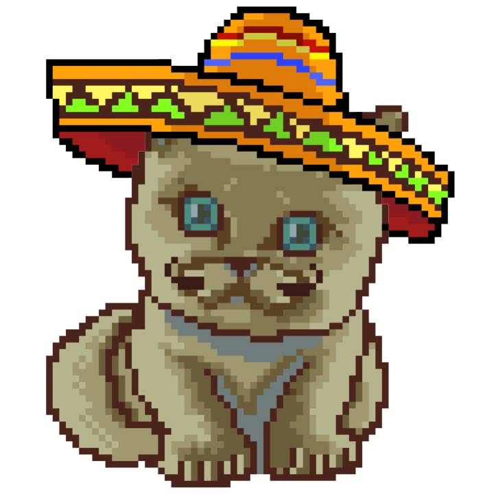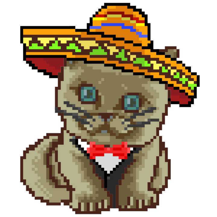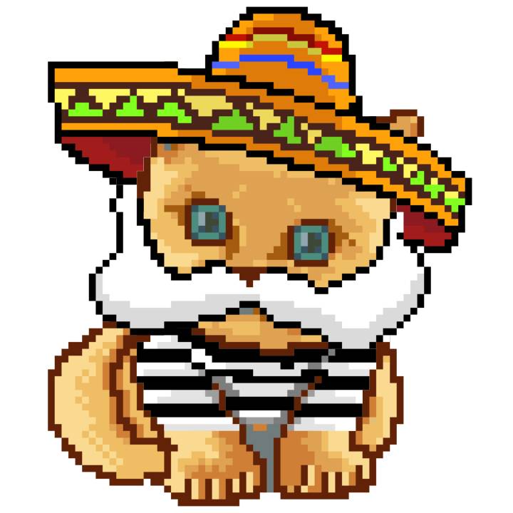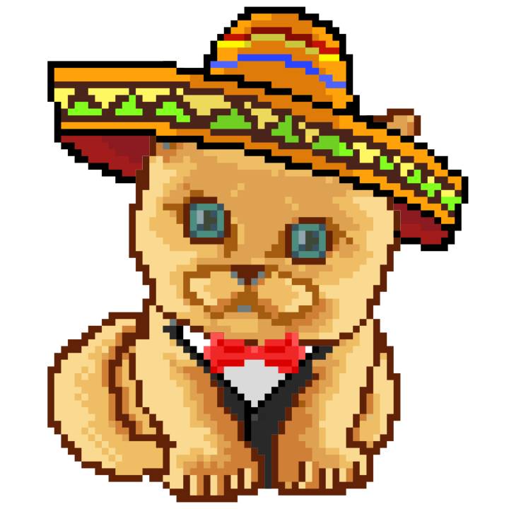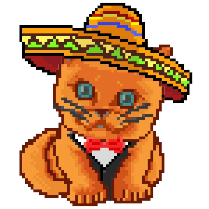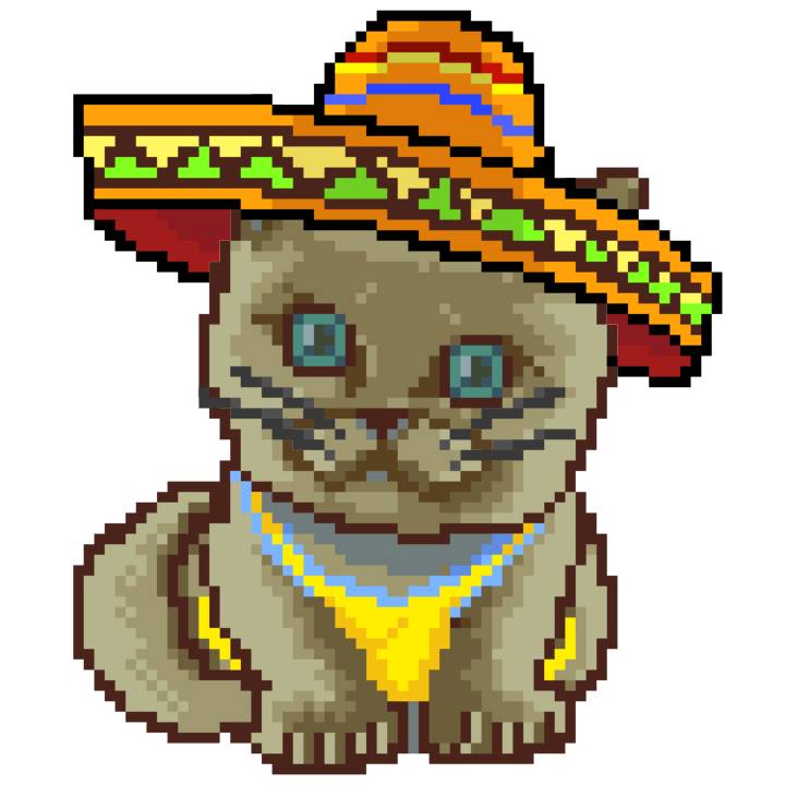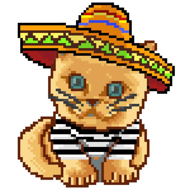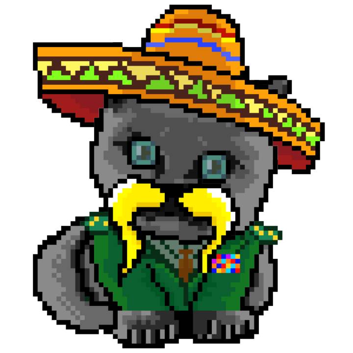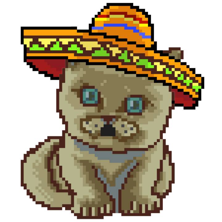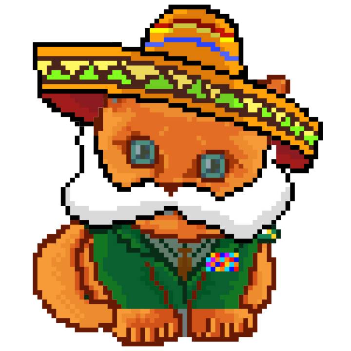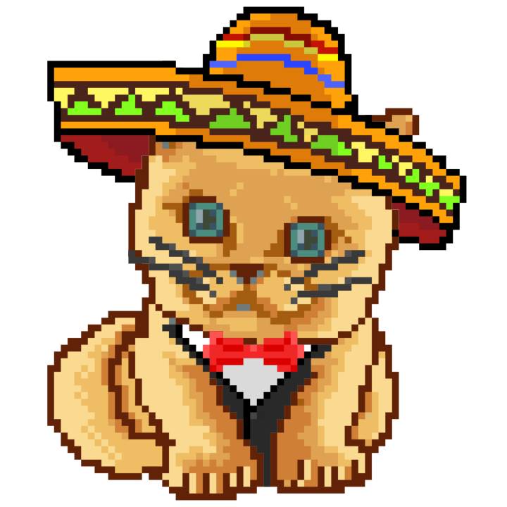 | Ashy Flashy Cat #52 | 570 | SandyBrown | Sombrero | Handlebar Mustache | General Top | View Image | View CatPage | View Opensea open_in_new |