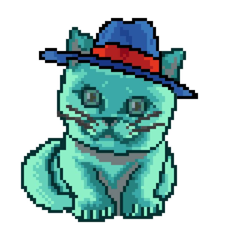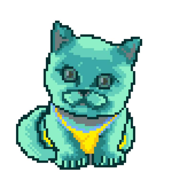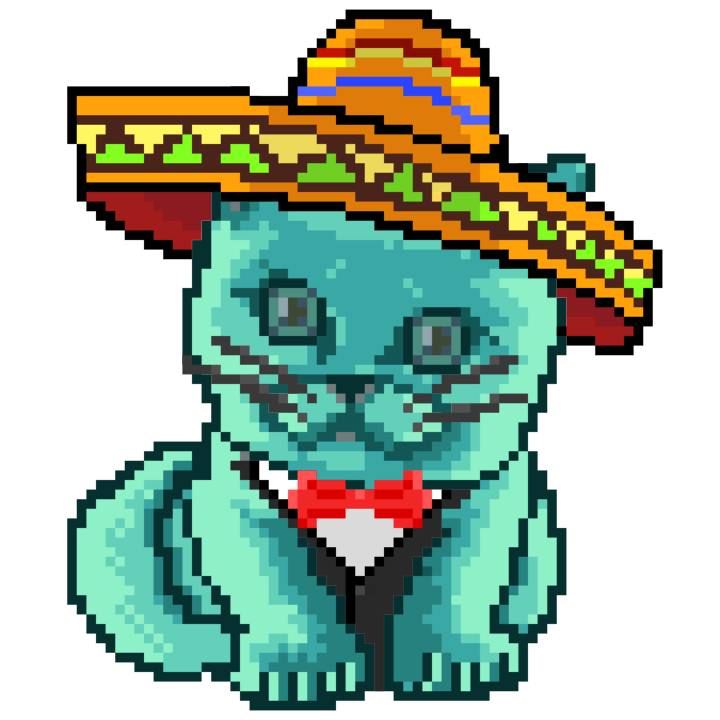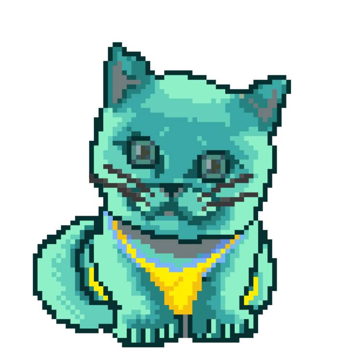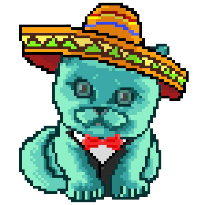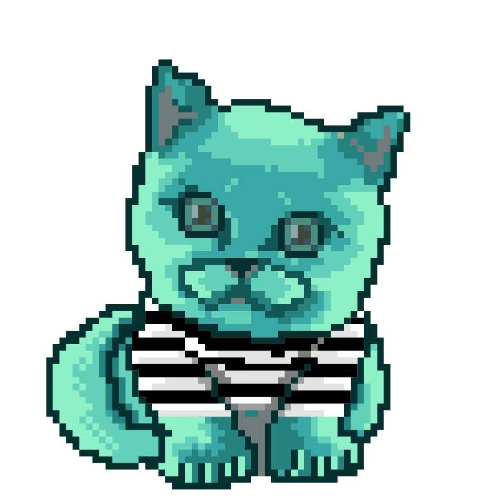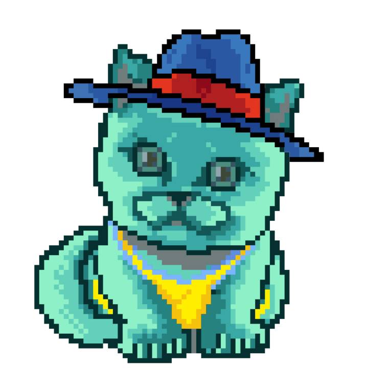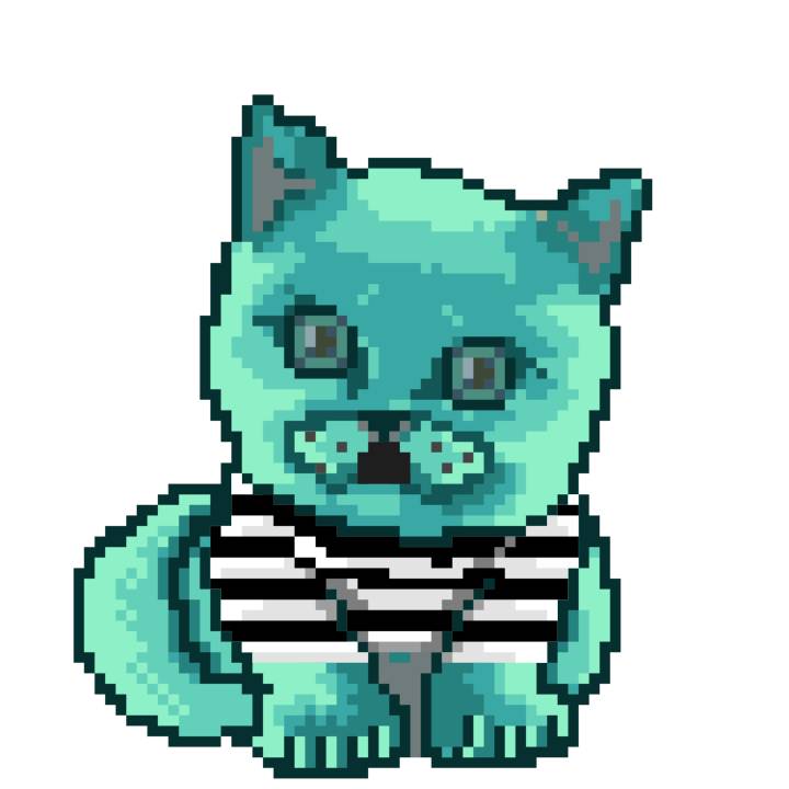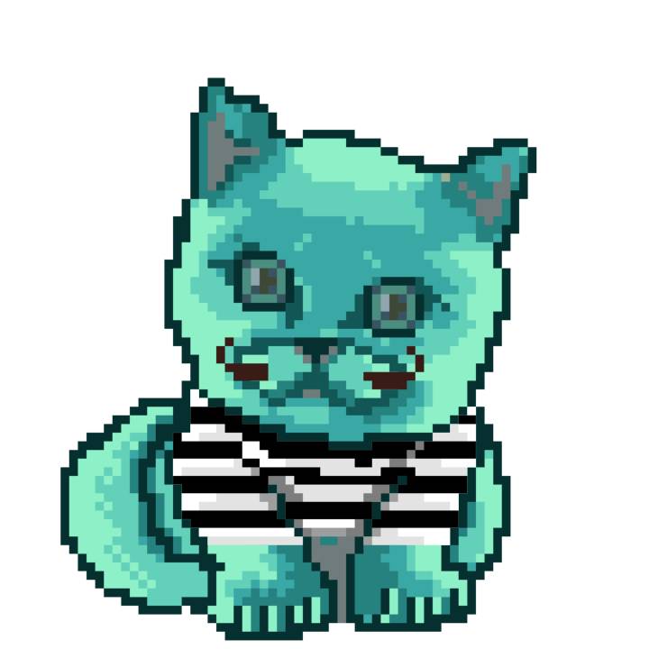 | Ashy Flashy Cat #64 | 1027 | Turquoise | Sombrero | Charlie Chaplin Mustache | Jersey | View Image | View CatPage | View Opensea open_in_new |