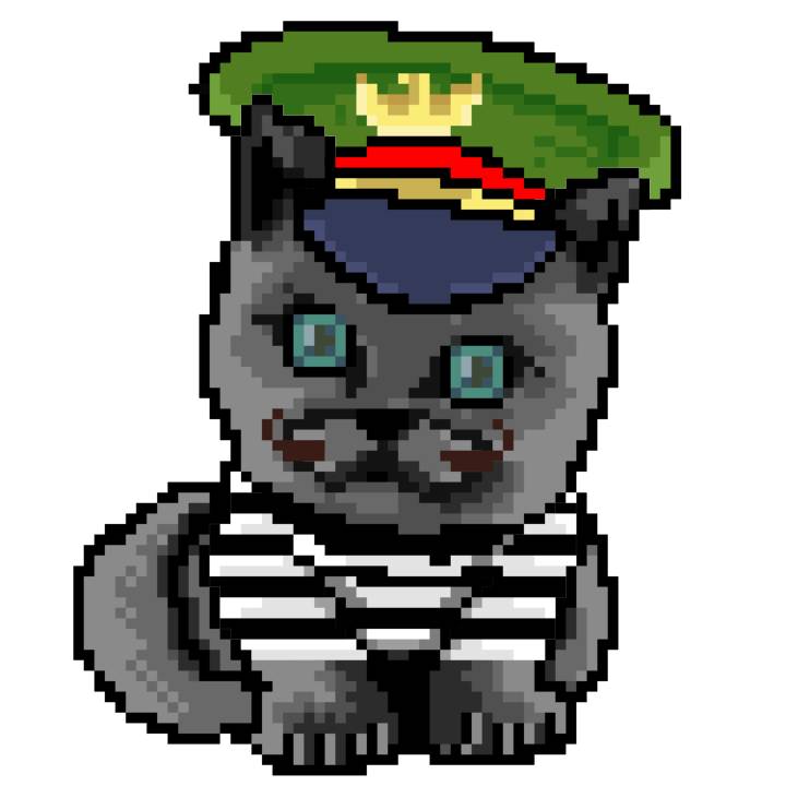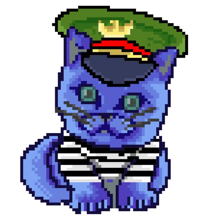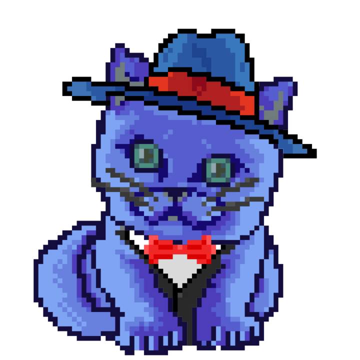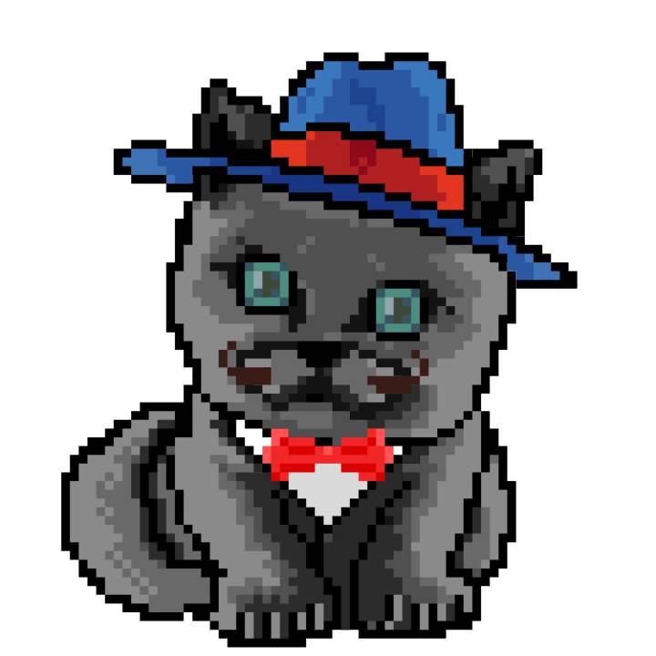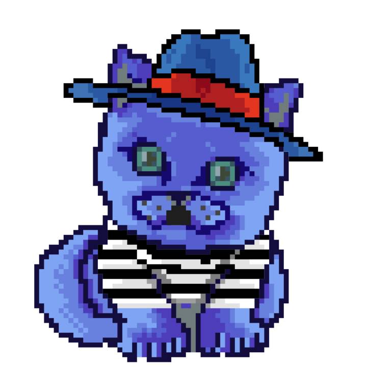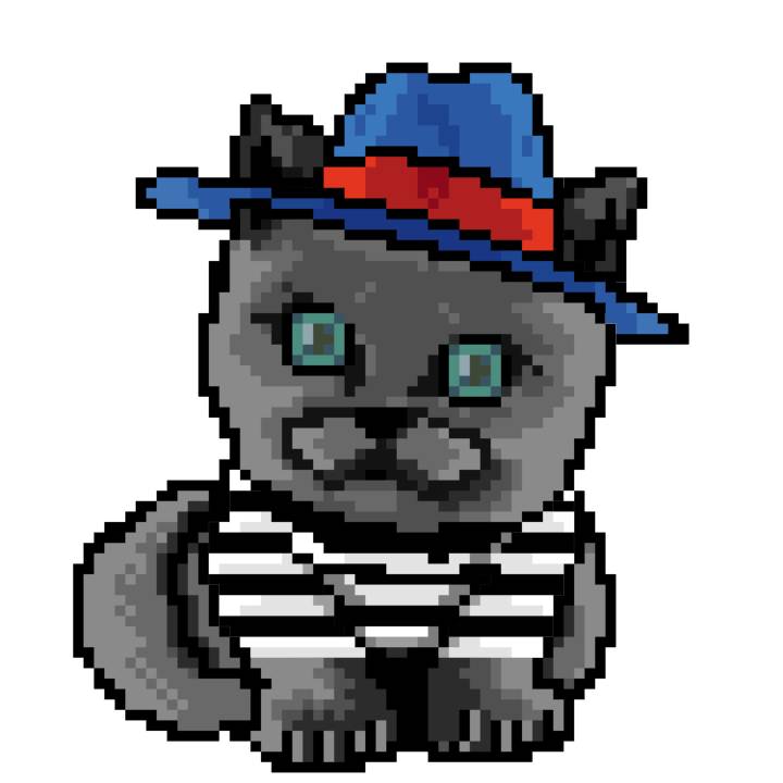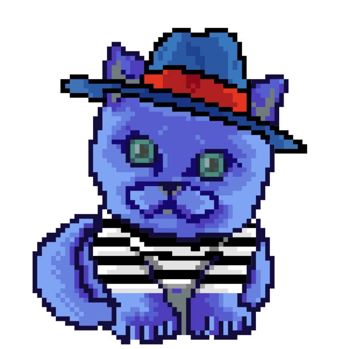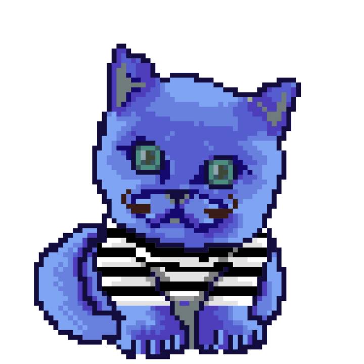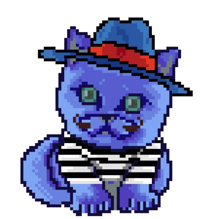 | Ashy Flashy Cat #1436 | 642 | Blue | Bowler | Charlie Chaplin Mustache | Jersey | View Image | View CatPage | View Opensea open_in_new |