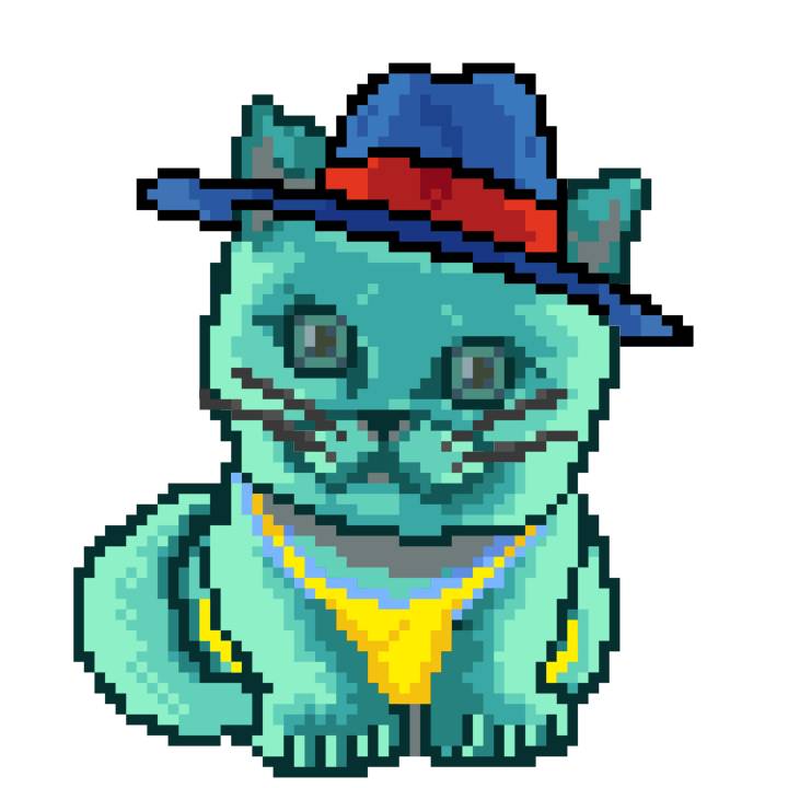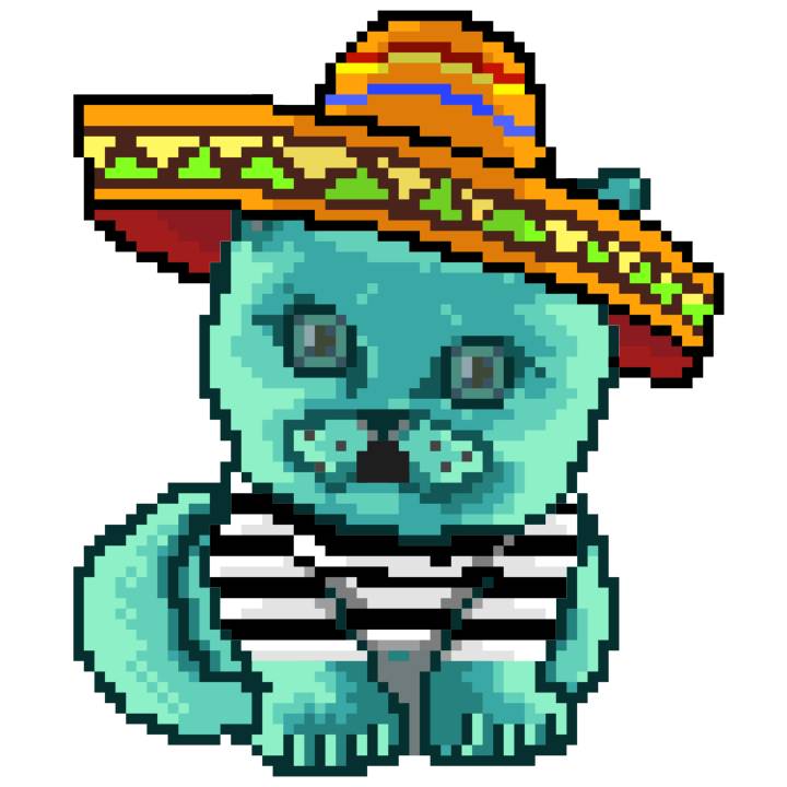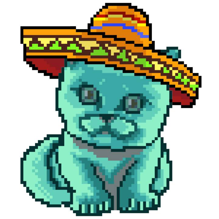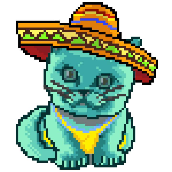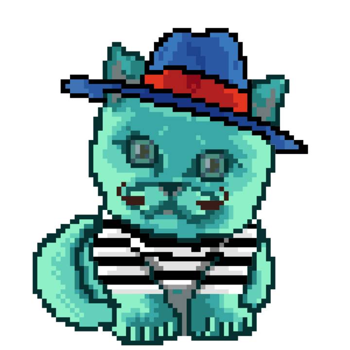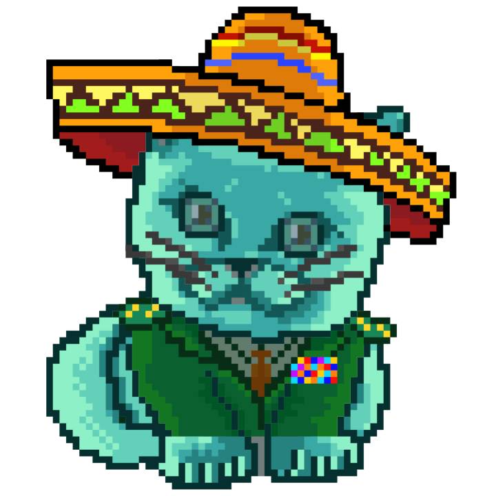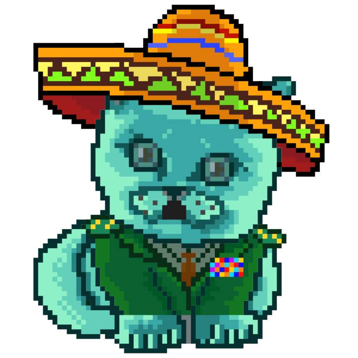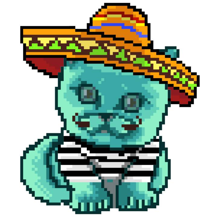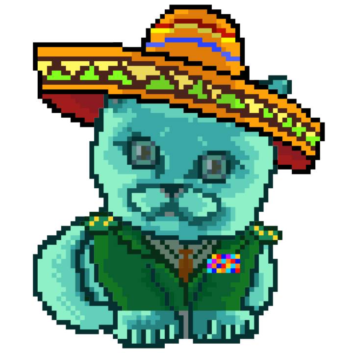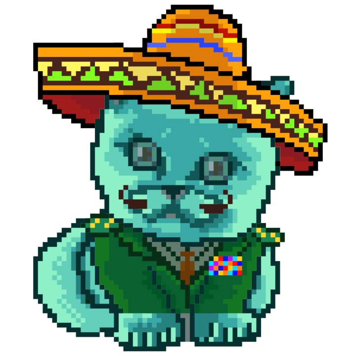| Ashy Flashy Cat #37 | 1027 | Turquoise | Sombrero | Handlebar Mustache | Jersey | View Image | View CatPage | View Opensea open_in_new |