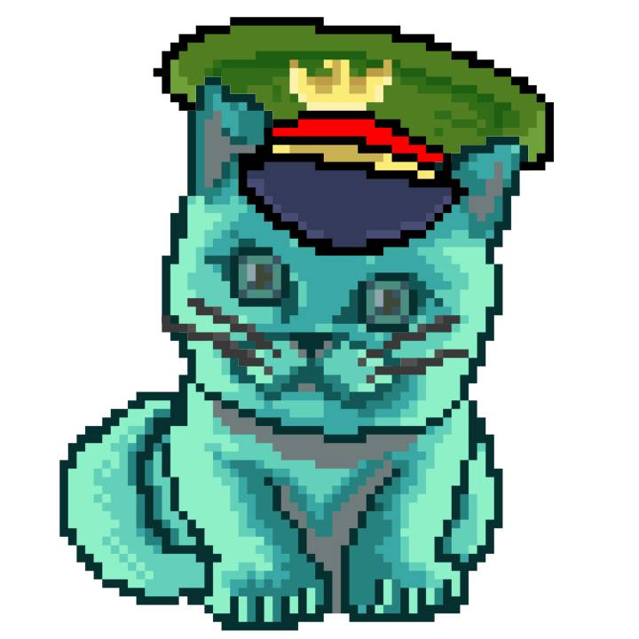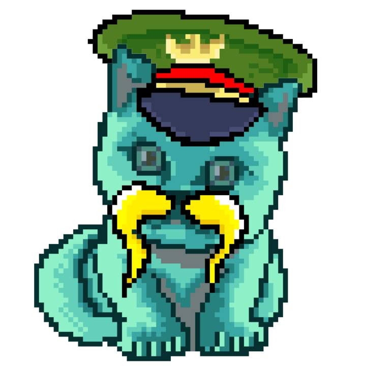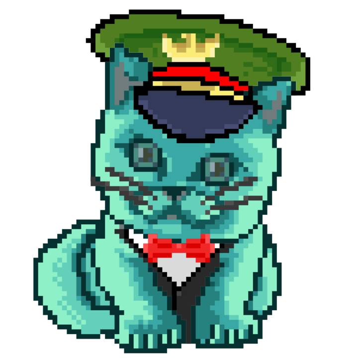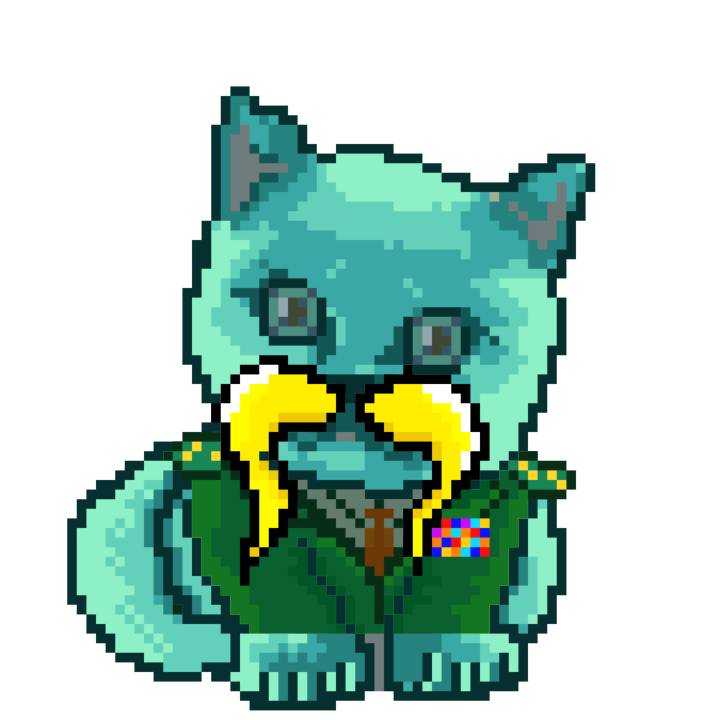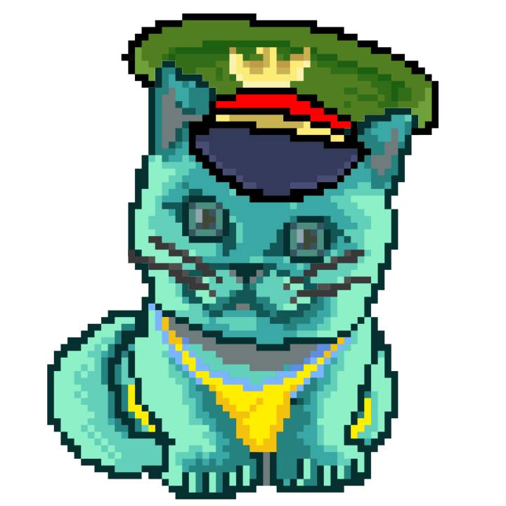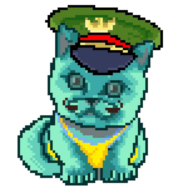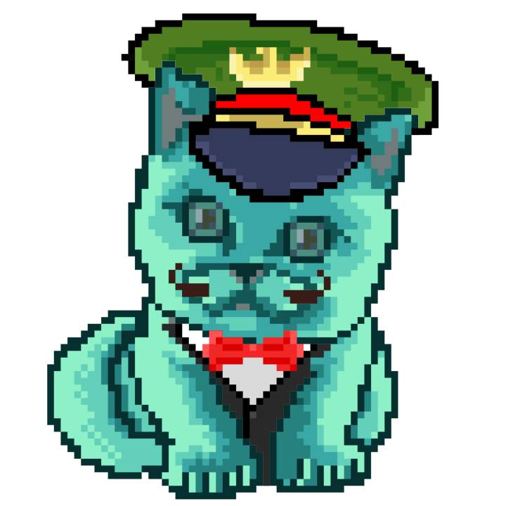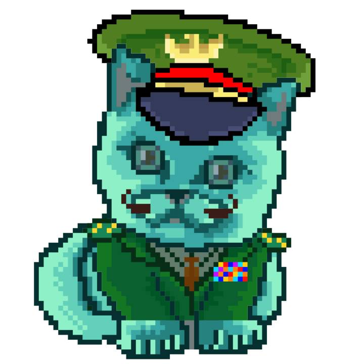 | Ashy Flashy Cat #1423 | 642 | Turquoise | Beret | Charlie Chaplin Mustache | No Uniform | View Image | View CatPage | View Opensea open_in_new |