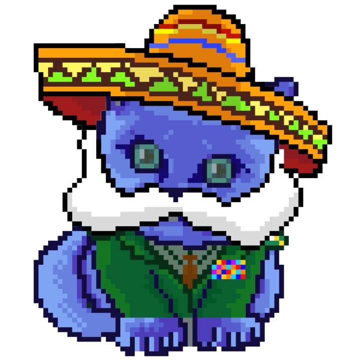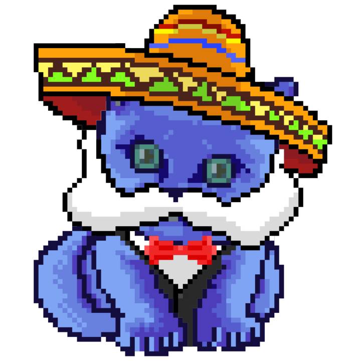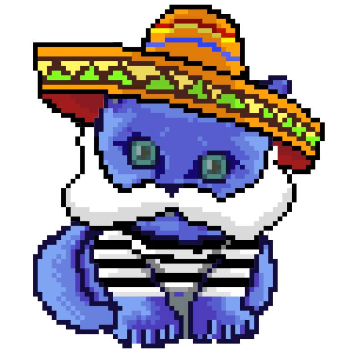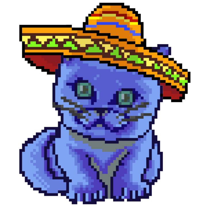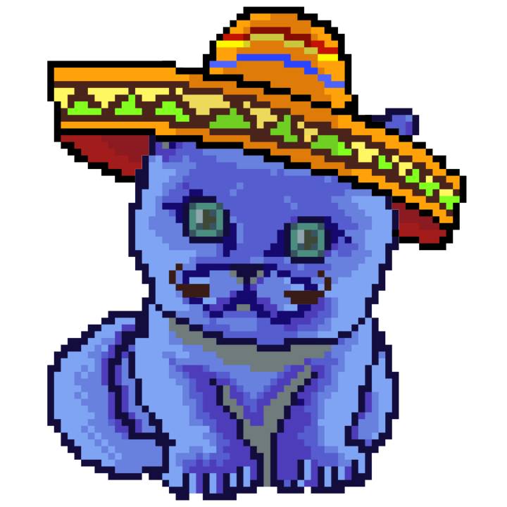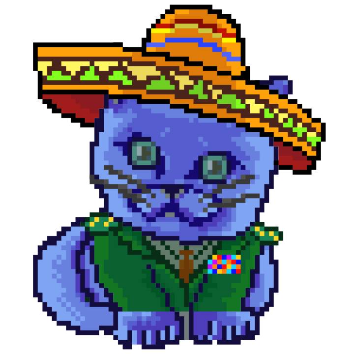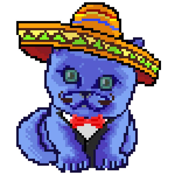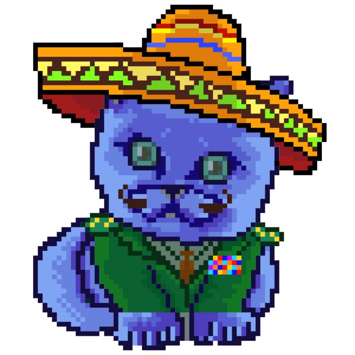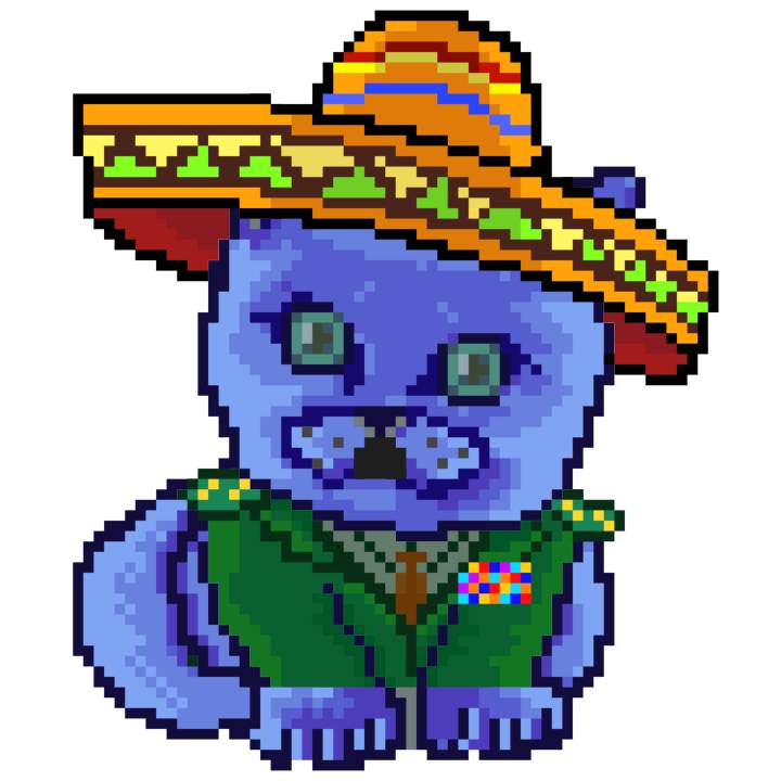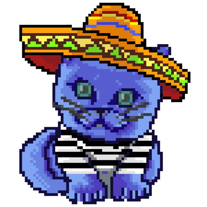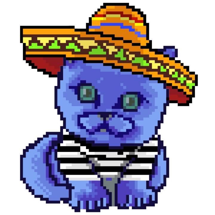 | Ashy Flashy Cat #96 | 1359 | Blue | Sombrero | Handlebar Mustache | General Top | View Image | View CatPage | View Opensea open_in_new |
