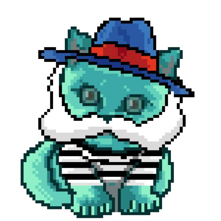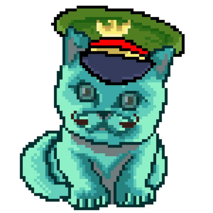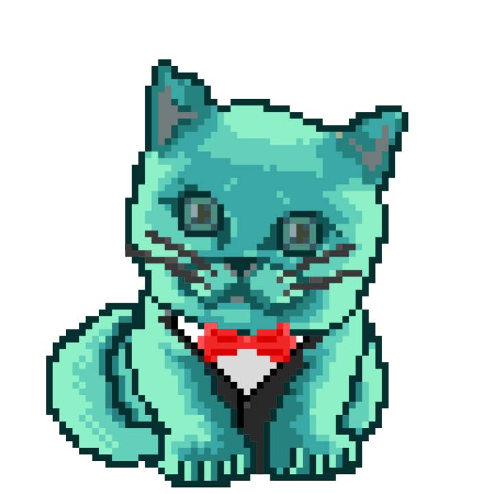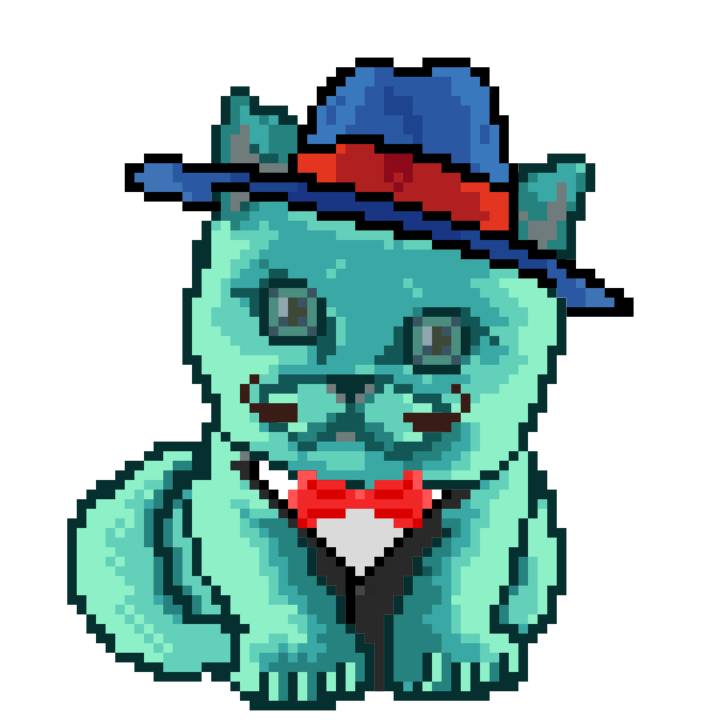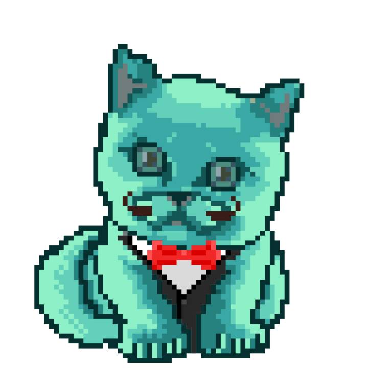 | Ashy Flashy Cat #1401 | 1027 | Turquoise | Beret | Charlie Chaplin Mustache | General Top | View Image | View CatPage | View Opensea open_in_new |