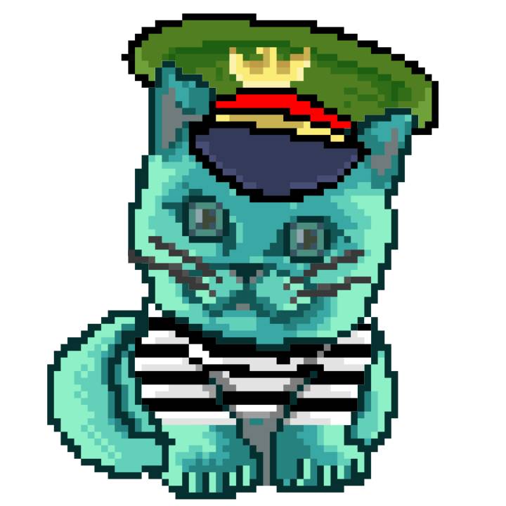 | Ashy Flashy Cat #1458 | 305 | Turquoise | Beret | Viking Mustache | Jail Top | View Image | View CatPage | View Opensea open_in_new |